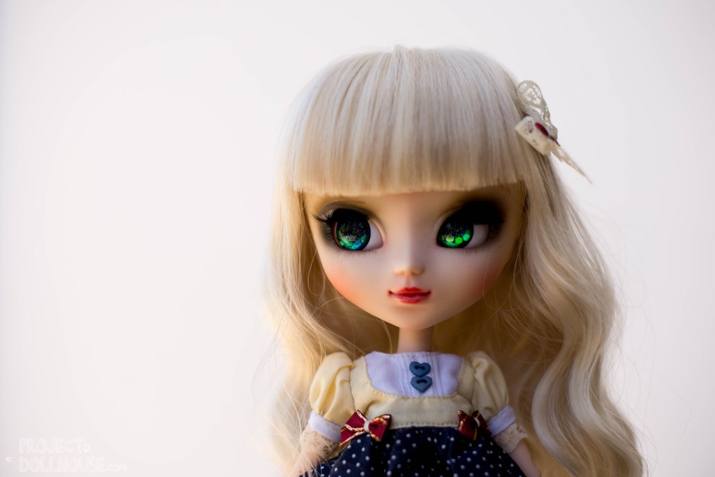 I tried a few lip colours on her before I settled on a bright cherry red. She’s wearing the wig that she came with (how gorgeous is that cute little bow) and her own dress. I love how Thalassa is on a Pure Neemo body. It seems to suit her quite well.