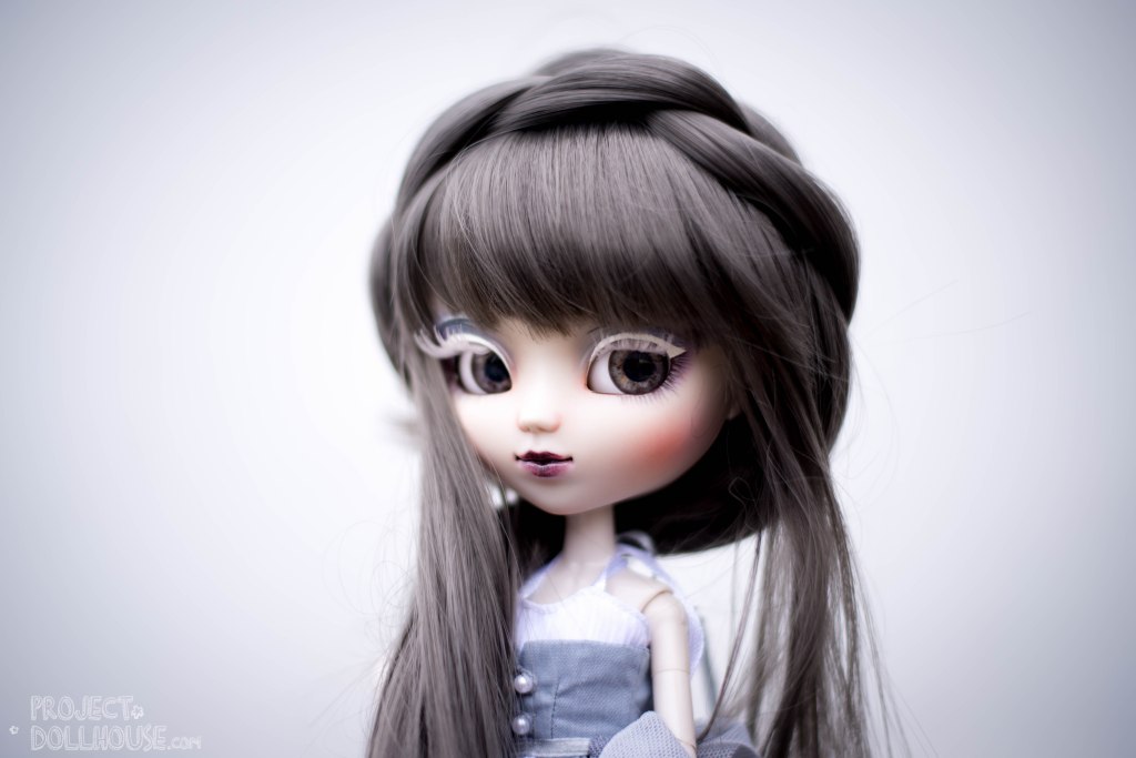 Emmeline’s faceup is a little bit unusual. She has a smokey eye in blues and purples, and some white eyeliner, matched with white lashes. Her lips are a deep eggplant purple, and she has some peachy blush on her cheeks. She’s wearing a gorgeous pair of grey-green Puppelina eyechips.